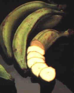 A l'est du champ de Manioc, une petite bananeraie. Nous sommes surpris de voir les régimes de bananes pousser à l'envers... Il s'agit là de bananes plantin : banane-légume, le féculent qui accompagne poissons et volailles. Son goût est légèrement acidulé et ressemble un peu à la patate douce. (nom botanique : Musa paradisiaca de la famille des musacées).On la surnomme banane à cuire ou banane-farine. Nous en avons goûté pour la première fois chez l'oncle de Jules.