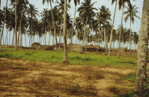 Nous restons toutes les trois pour garder le véhicule, et comme il faut toujours voir les choses du bon côté, Amélie et Momo décident de "bronzer"... ... à travers les cocotiers, tandis que j'imprime quelques images sur la pellicule : un village entre mer et fleuve, une jeune femme sortant de sa paillote avec ses petits garçons, propres et bien habillés... la cime des cocotiers sous le ciel bleu...