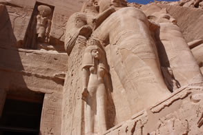 Râ nous accompagne et comme chaque matin vient baigner de sa lumière les deux façades monumentales des temples d'Abou Simbel. Les quatre effigies royales face au Nil étaient sensées apaiser ses caprices. Pour la première fois dans l'icônographie royale, le souverain a tenu à mettre à ses côtés, outre son épouse, une grande partie de sa descendance offrant au visiteur une galerie de portraits.