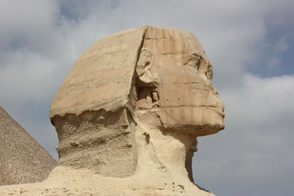 A 350 mètres de Khéops se trouve le grand Sphinx : Abou el Hol (le père de la terreur) ; ultime avatar de 45 siècles de vénération et de légendes. Lion à tête humaine, portrait du pharaon Khéphren coiffé du Némès, c’est le plus ancien temple non funéraire connu à ce jour. Placé devant les temples, il en défendait l’entrée. Féroce envers ses ennemis, il peut être aussi protecteur des justes.