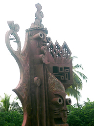 Une des deux statues d'egun (Kouvito ou revenant) qui encadre la porte du Non-Retour. Ce sont des masques de la culture Yorouba, qu’on retrouve également chez les Fon. Ils incarnent les défunts d’une famille ou d’une collectivité familiale.