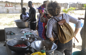 On s'interpelle, on échange autour d'un repas partagé sur la plage : poissons grillés, frites et ananas.